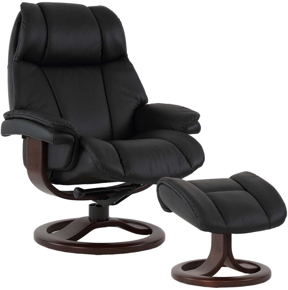 En deilig lenestol med fotskammel i moderne design. Basen er laget av tre med espresso-finish og setet er dekket med nydelig svart helskinn for maksimal komfort.
