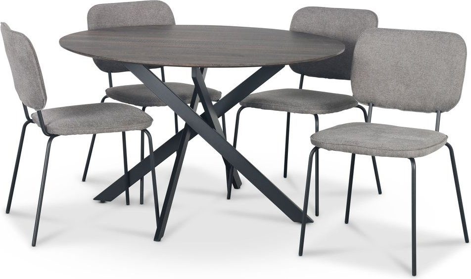 Hogrän spisegruppe bestående av et bord på Ø120 cm med topplate av MDF i mørk treutførelse, understell av svart pulverlakkert metall. Inkludert 4 stk. Lokrume stoler med grått trekk og svart ramme. En spisegruppe i stilig moderne design. Fokus på et minimalistisk design og fargevalg som passer godt sammen.