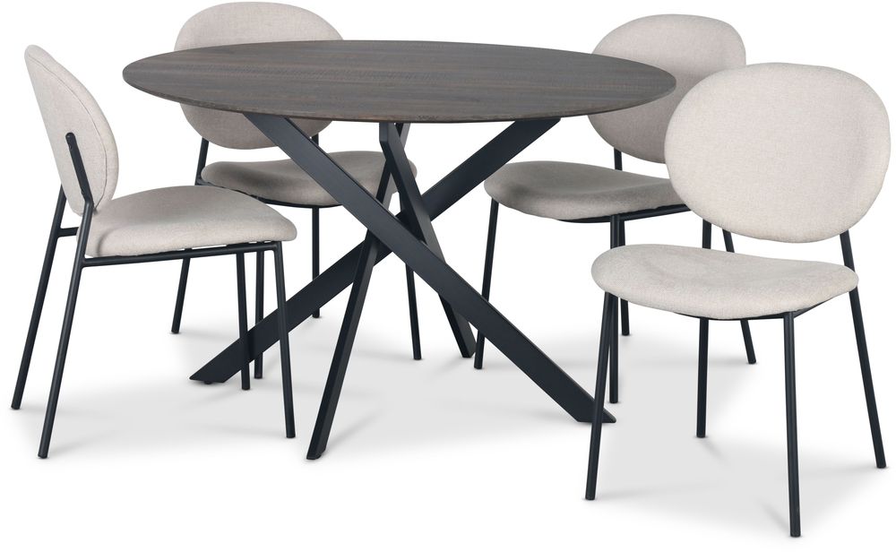Hogrän spisegruppe bestående av et bord på Ø120 cm med topplate av MDF i mørk treutførelse, understell av svart pulverlakkert metall. Inkludert 4 stk. Tofta stoler med beige trekk og svart ramme. En spisegruppe i stilig moderne design. Fokus på et minimalistisk design og fargevalg som passer godt sammen.