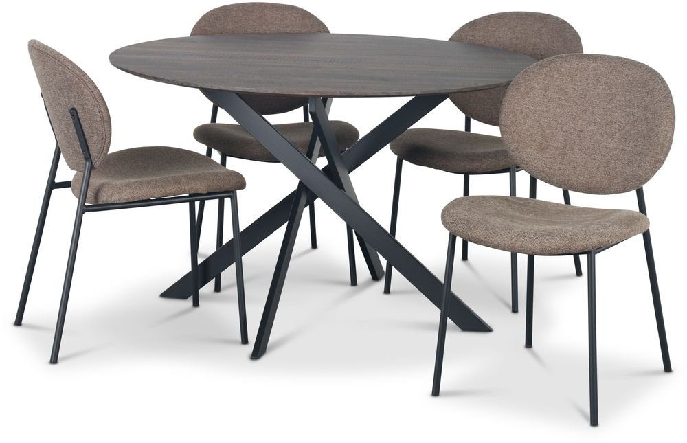 Hogrän spisegruppe bestående av et bord på Ø120 cm med topplate av MDF i mørk treutførelse, understell av svart pulverlakkert metall. Inkludert 4 stk. Tofta stoler med brunt trekk og svart ramme. En spisegruppe i stilig moderne design. Fokus på et minimalistisk design og fargevalg som passer godt sammen.