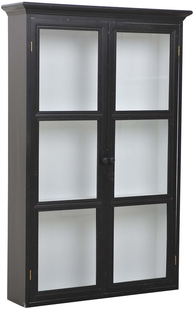 Veggskap i svart med hvit innside. Skapet har 2 dører i glass.