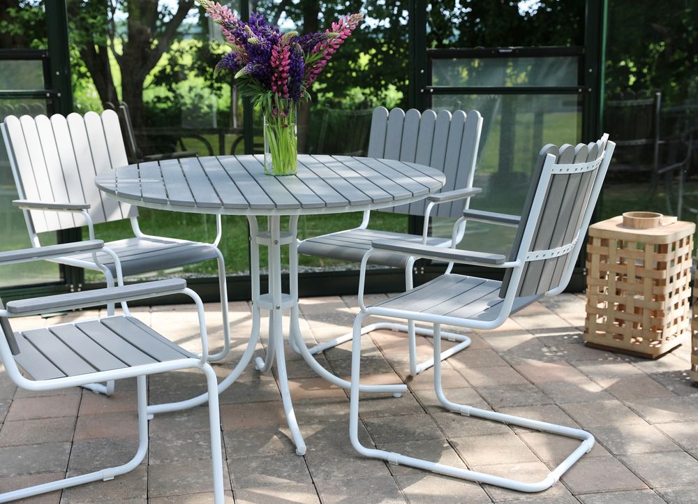 Holmsund er en klassisk utegruppe, laget av grått aintwood og ramme av slitesterkt hvitt metall. Dette gjør utegruppen værbestandig og holdbar for å tåle uteplassens miljø. Gruppen har et skandinavisk design.