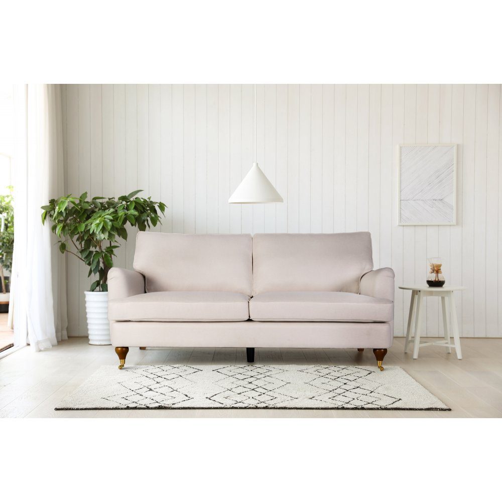 Sofaen finnes i et beige og stilrent trekk som passer i alle hjem.