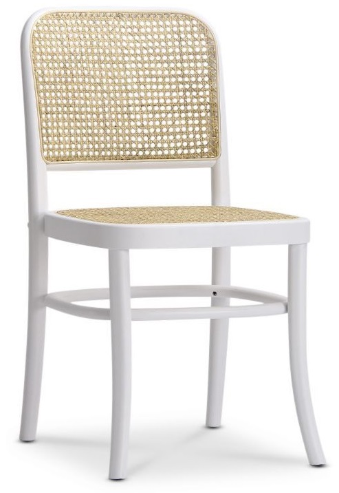 Huffman stol med ramme av solid bøk i hvit design, sete og ryggen av naturlig farget rotting.