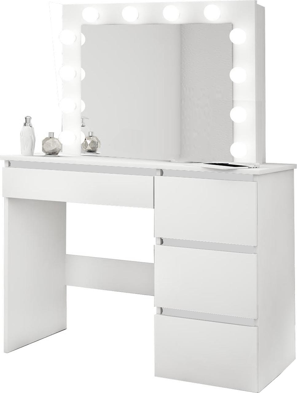 Sminkebord med LED-belysning og mye oppbevaringsplass. Speilet er omgitt av 12 LED-pærer.