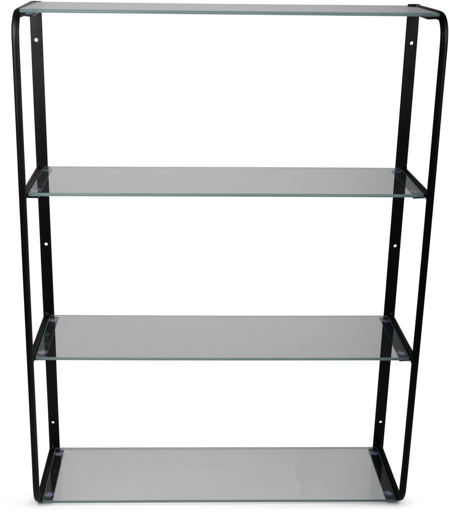 En pen hylle med moderne design. Rammen er tilvirket i svart metall og de fire hylleplan er av klarglass.
