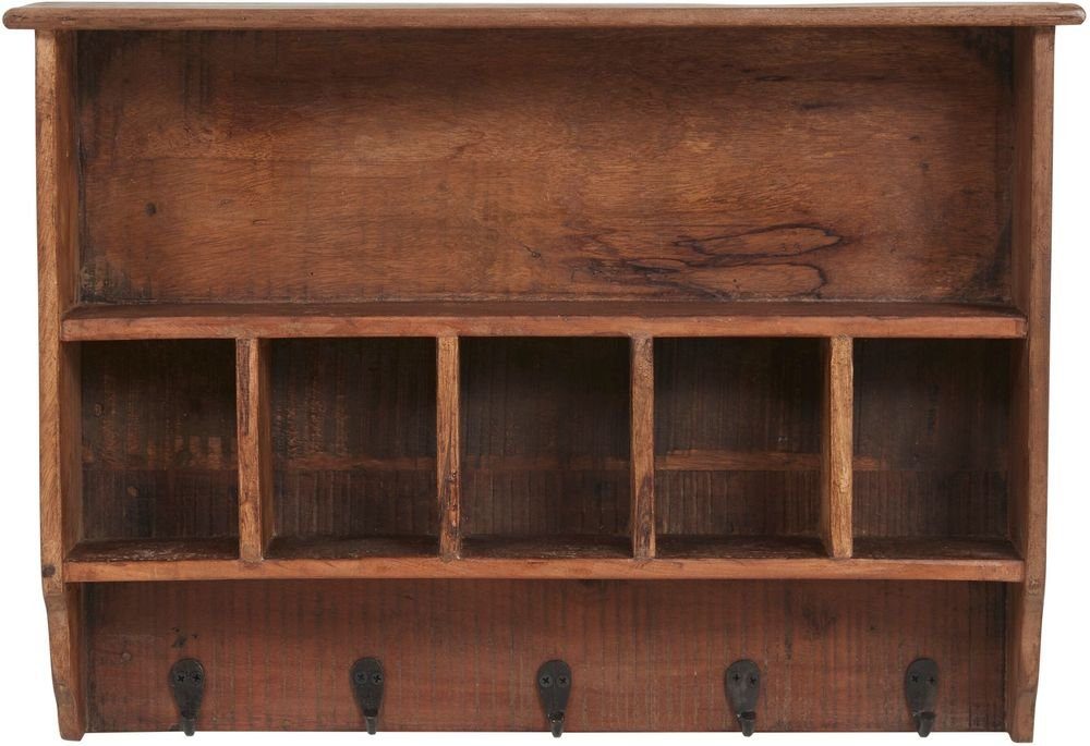 Hylle i rustikk stil med små rom, hyller og kroker. Her kan du oppbevare mindre gjenstander, kombinert med kroker for å henge opp håndklær, forklær eller annet.
