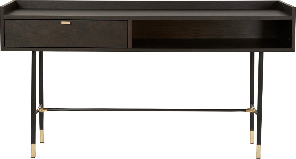 Modernt og stilrent konsollbord med oppbevaringsrom. Mørk brunbeiset eikefiner. Inngår i Impala-serien vår. Håndtak og detaljer på bena i messing. Konsollbordet kommer montert i utenom bena som lett skrus på.