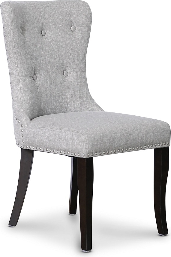 Fulltrukket stol i stilig grå stofftrekk. En komfortabel og robust stol som gir et solid inntrykk og passer til mange ulike spisebord. Brunbeisede treben og et rygghåndtak på baksiden av ryggen som matcher stolens nagler. Barbert rygg for å gi komfortabel sittestilling.