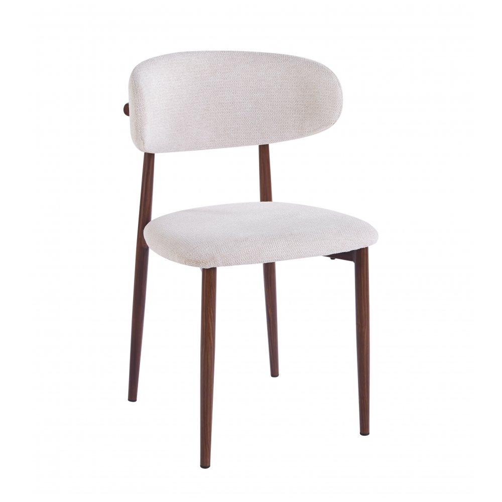 Ingrid spisestol med et mykt polstret sete trukket med et mykt beige stoff. Ramme i valnøttfoliert metall. Spisestolen passer til både runde og rektangulære spisebord.