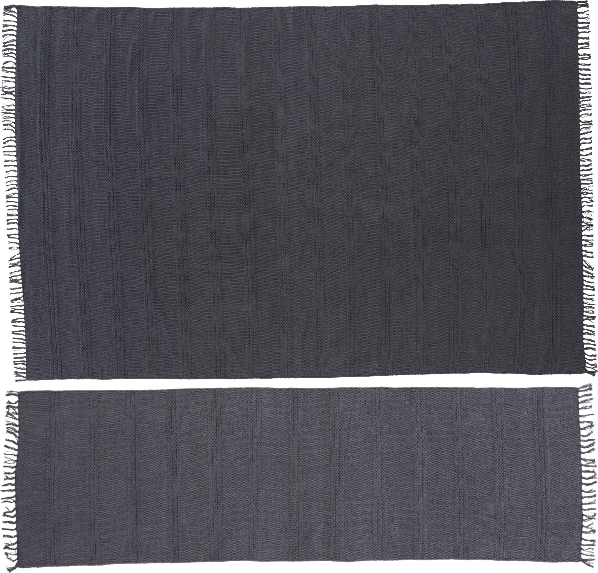 Bomullsteppe i sotgrå farge med dekorative frynser og flettede detaljer.