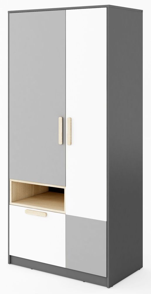 En pen garderobe med moderne design. Tilvirket i MDF og er veldig romslig med gode oppbevaringmuligheter i form av to skap og en skuff, samt et åpent hylleplan.