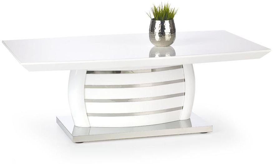 Et fint salongbord med moderne design. Understellett er produsert i krom metall med detaljer i hvitt. Bordplaten er av hvitlakkert MFP (premium treplate).