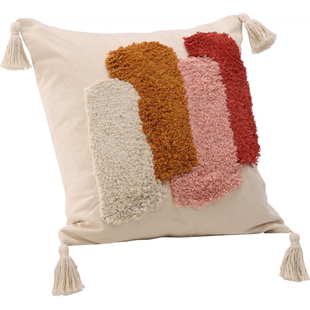 Firkantet putetrekk med stilig bunnfarge i hvitt og deilig mønster i tuftet materiale i fargene hvit, brun, rosa og rød. Etuiet har også dusker i hvert hjørne som bidrar til et mer lekent uttrykk. Polyester- og bomullsblandingen er både slitesterk og fleksibel. Dette er virkelig et putetrekk som utstråler kunst og motebevissthet. Sett et personlig preg på interiøret med en fargerik pute som skiller seg ut.