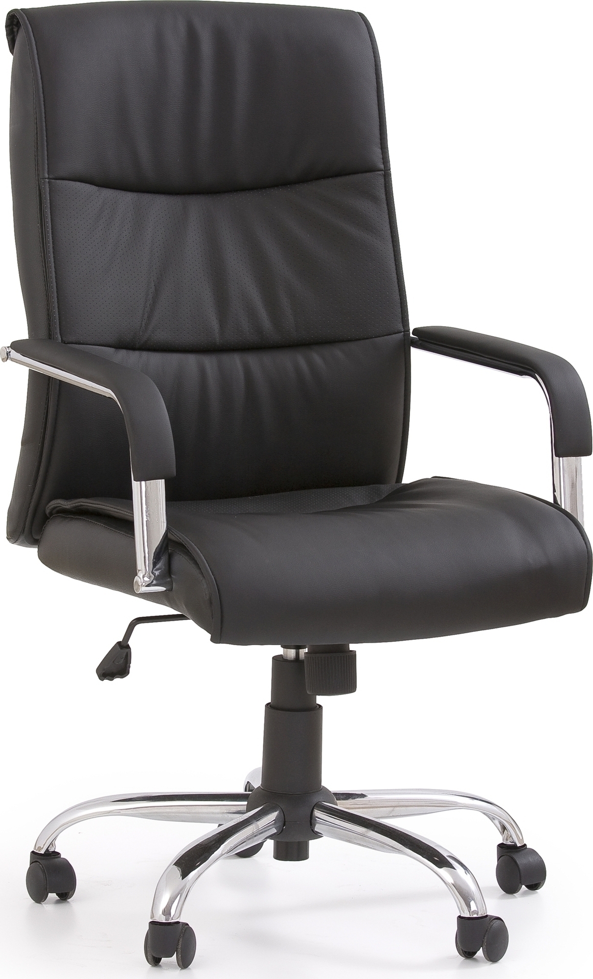 Herlig kontorstol med et stilrent design. Trukket med et svært behagelig svart kunstskinn med detaljer i forkrommet metall. Høy- og senkbart sete og lett å flytte takket være hjulene på den forkrommete stjernefoten.