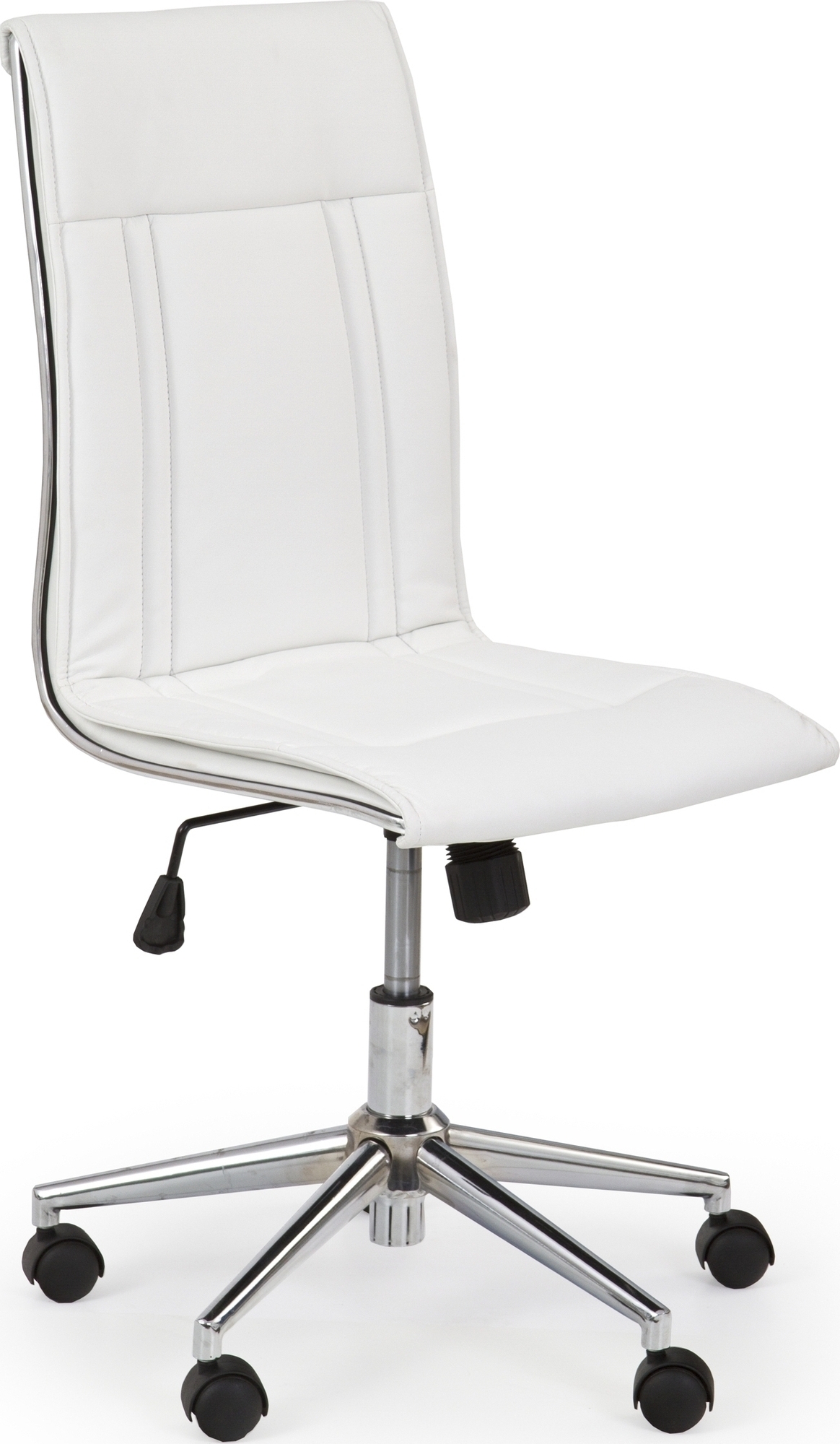 En herlig kontorstol i et stilrent design. Laget i metall med sete som er trukket i et svært behagelig svart kunstskinn som gir maksimal komfort. Setet kan justeres i høyde, i tillegg kan stolen flyttes enkelt takket være hjulene på den forkrommede stjernefoten.