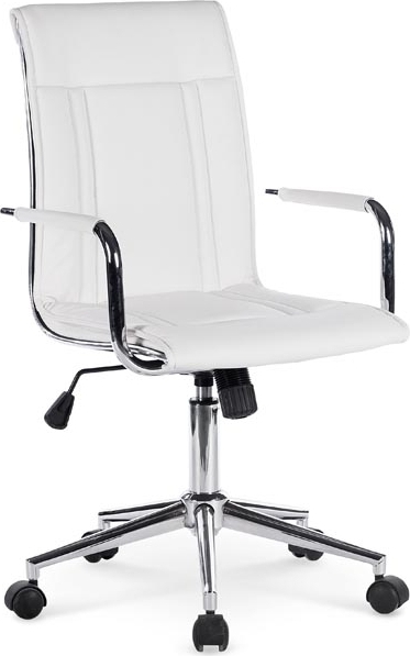 En herlig kontorstol med et stilrent design. Produsert i metall med et sete som er kledd med et meget behagelig hvit kunstlær for maksimal komfort. Setet er hev- og senkbar, og stolen er enkel å forflytte takket være hjulene på den krommede stjernefoten.