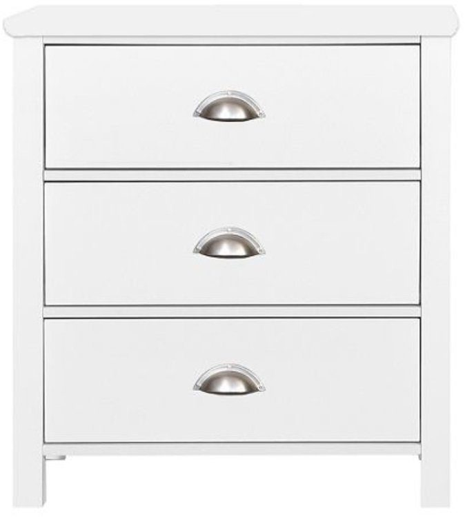Klassisk kommode med overflate av hvit laminat, halvmåneformede håndtak. Byrån erbjuder 3 skuffer med oppbevaring. I serien Källunda finnes det både kommoder i ulike størrelser og sidebord og benker.
