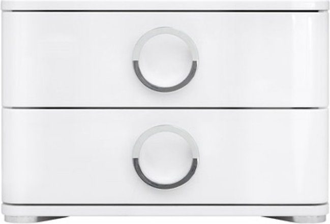 Stilig nattbord i hvit høyglans med to skuffer. Dekorative håndtak, Kombiner gjerne med andre møbler i samme serie.