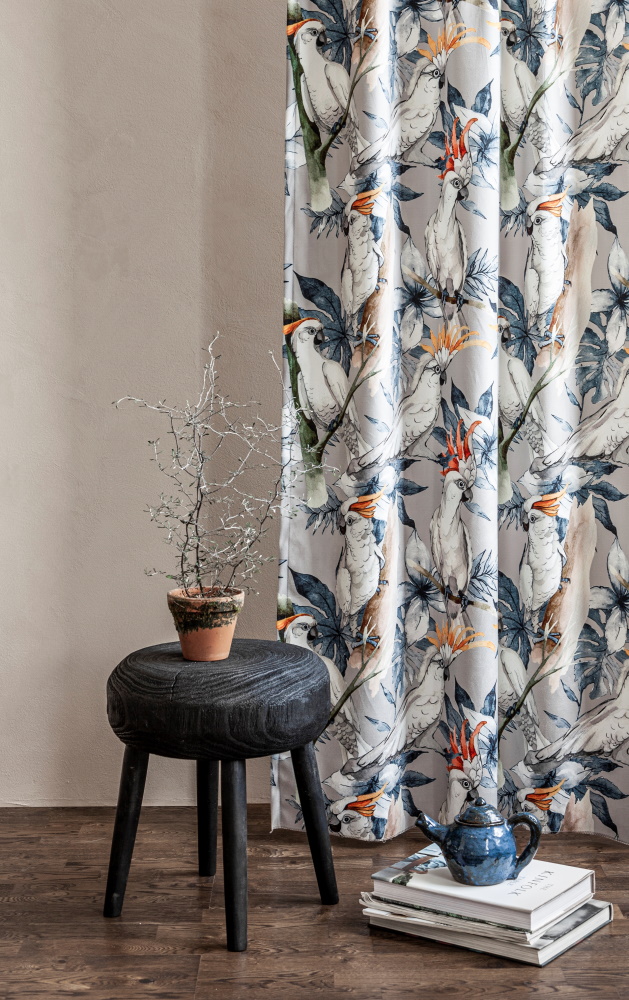 Vakker gardin med trykte fugler. Oppheng: flerbåndslengde som kan henges på tre forskjellige måter. Med fingerkroker/ringer på stangen eller i løkkene. Foldefiks inkludert.