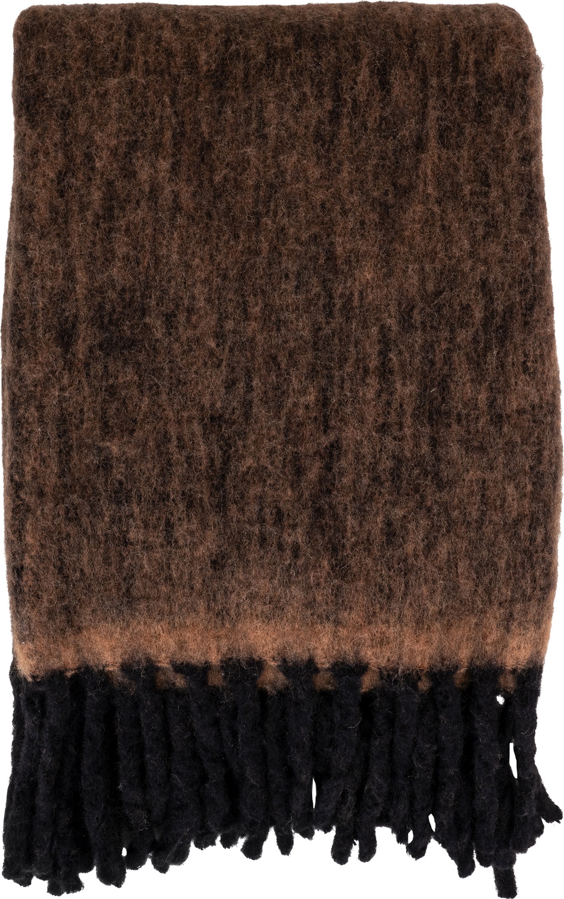 Pledd av tekstilblanding med dekorative frynser.