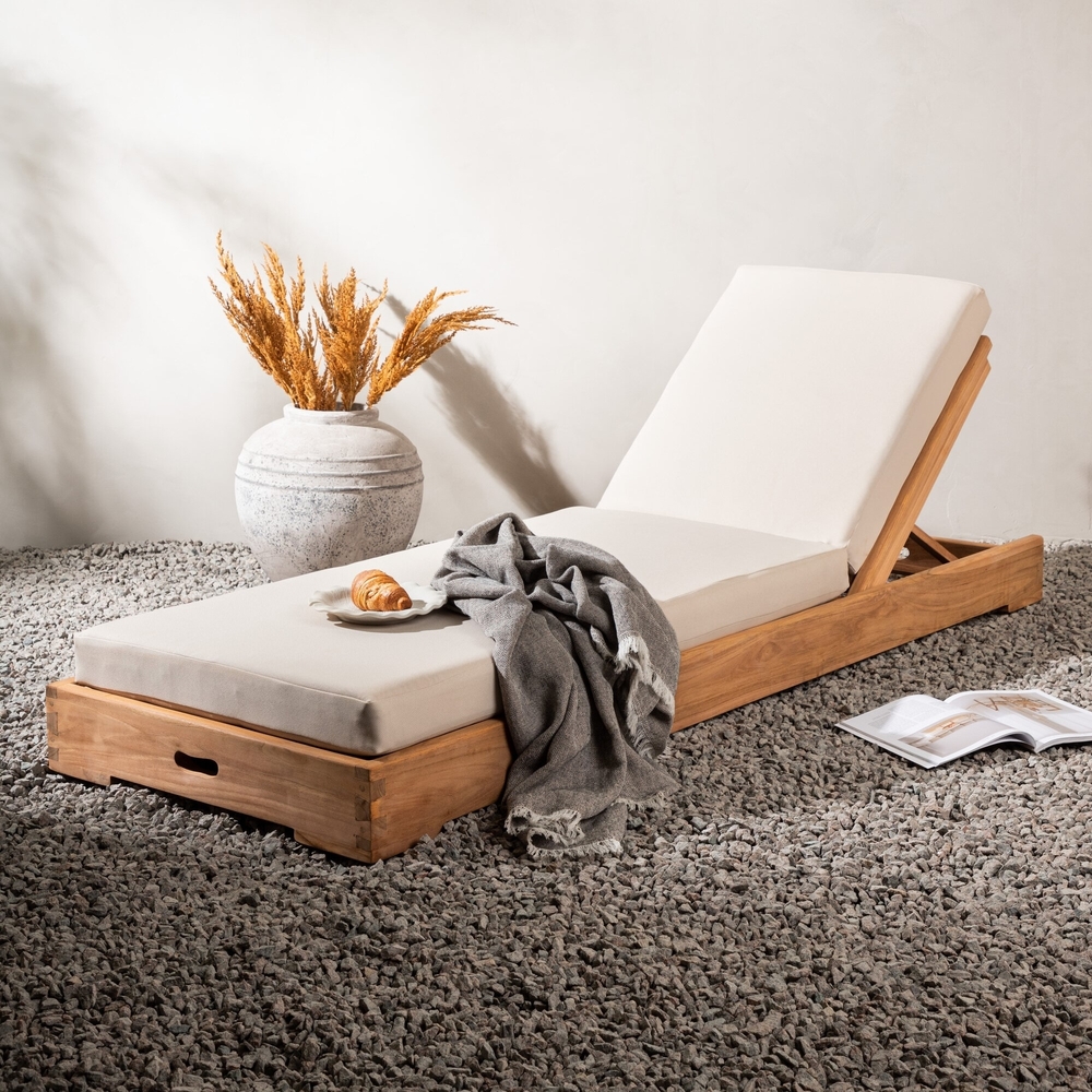 Solsengen fra Kenya-serien i teak har et tidløst og stilig design som passer i mange miljøer. Solsengen har en sammenleggbar rygg som kan justeres til den vinkelen som føles mest behagelig for øyeblikket og kommer med en beige pute. Et must for alle late dager!
