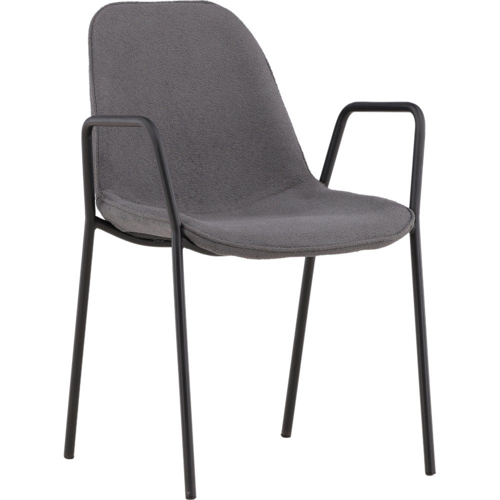 Nydelig stol i skandinavisk design med helpolstret sete i grått stoff og smale stolben med integrerte armlener i sort metall. Det myke setet er polstret for ekstra komfort og inviterer til lange hyggelige middagsstunder. Match med et stilig spisebord og du får en komplett spisegruppe for hjemmets hjerte.