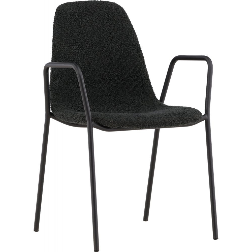 Nydelig stol i skandinavisk design med helpolstret sete i sort boucléstoff og smale stolben med integrerte armlener i sort metall. Det myke setet er polstret for ekstra komfort og inviterer til lange hyggelige middagsstunder. Match med et stilig spisebord og du får en komplett spisegruppe for hjemmets hjerte.