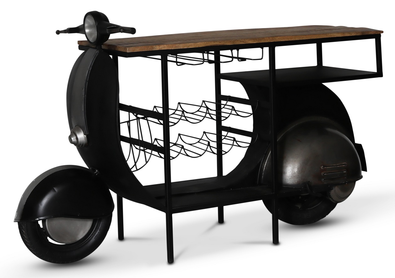 Denne klassiske Vespa som bardisk er noe for entusiasten. Topp av solid mango tre, ramme av metall farget i svart og sølv. Et originalt møbel med stil.