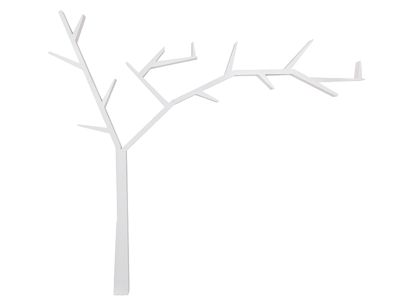 En koselig kleshenger med en kunstnerisk design. Kleshenger i form av et tre, tilvirket i tre med en hvit utførelse med et flertall hengere.
