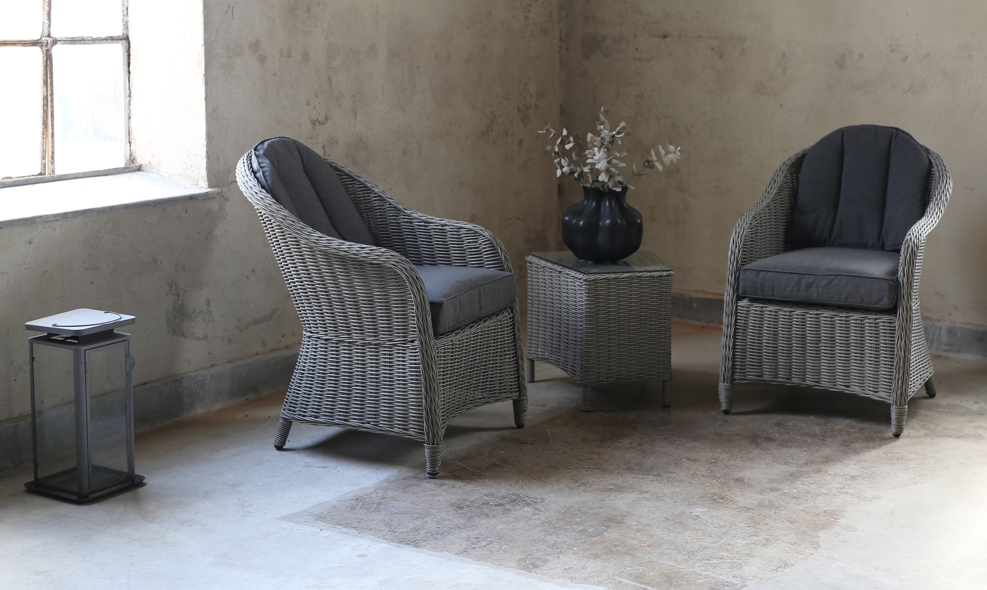 | Klassisk utendørs møbelgruppe i halvrunde grå rotting med matchende tykke seteputer for god komfort. Her kan både korte og lange stunder brukes. Inkluderer også matchende bord i rotting med toppplate av glass. | |