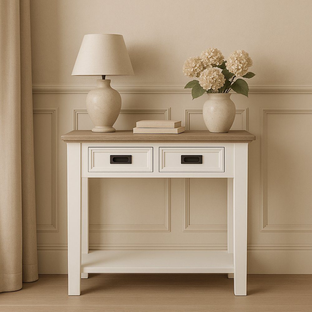 Et nydelig konsollbord med klassisk design. Laget i hvitt tre med grå topplate. Utstyrt med to skuffer for praktisk oppbevaring og en nedre hylle. Overflaten på møblene er behandlet for å gi et vintage-utseende og har dermed få merker og små skavanker. Fargeendringer, merker, reparasjoner og små sprekker er en del av dens unike utseende.