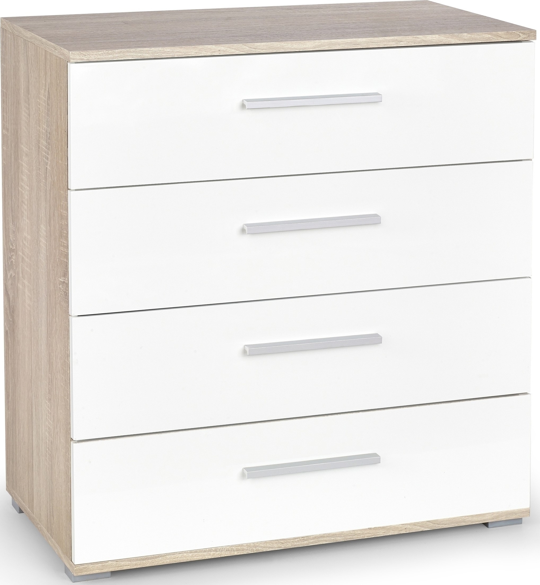 En stilren kommode med herlig design. Produsert i MFP (premium treplate) i hvitt og eikelaminat. Fire meget romslige skuffer for praktisk oppbevaring. Kommoden passer perfekt inn på flere ulike plasser i hjemmet.