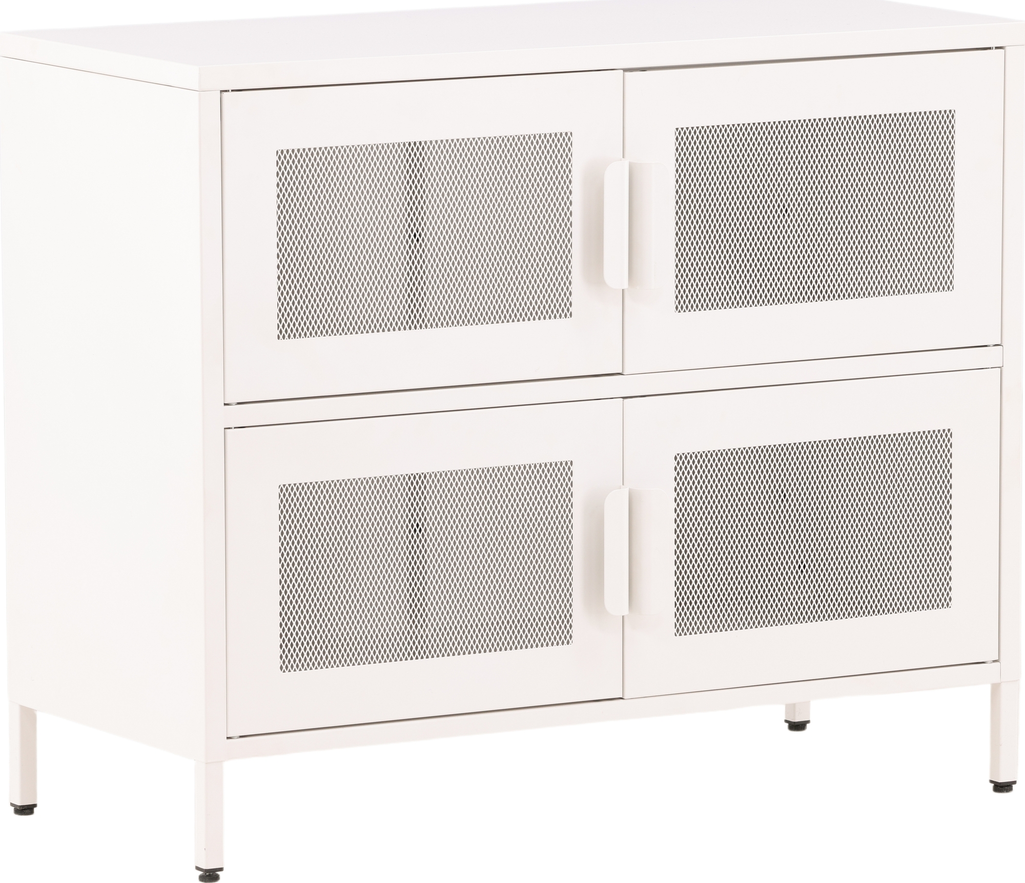 Innrede hjemmet smart og stilig med et praktisk oppbevaringsskap fra Krado-serien i deilig industridesign. Dette skapet er laget av hvitt stål med nettingdører som blir en smakfull detalj for øyet. Skapet har to hyller med fire dører som skaper god plass til halvskjult oppbevaring. Dybden på skapet gir et robust inntrykk og egner seg perfekt til avlastning selv på topplate - dekorer med dekorasjoner og skap et blikkfang som imponerer. De smale, høye bena som løfter skapet opp skaper en luftig følelse og gjør det også lettere for støvsugeren. Nyt smarte møbler.