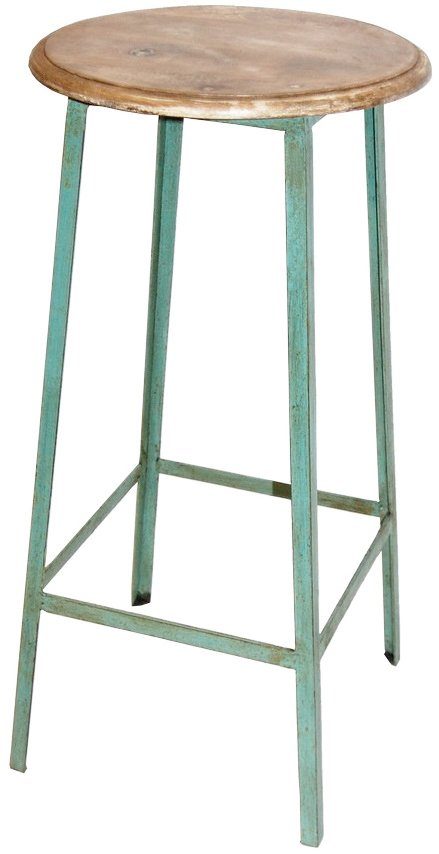 Liten, men robust barstol med base i mintgrønn metall og tresete.