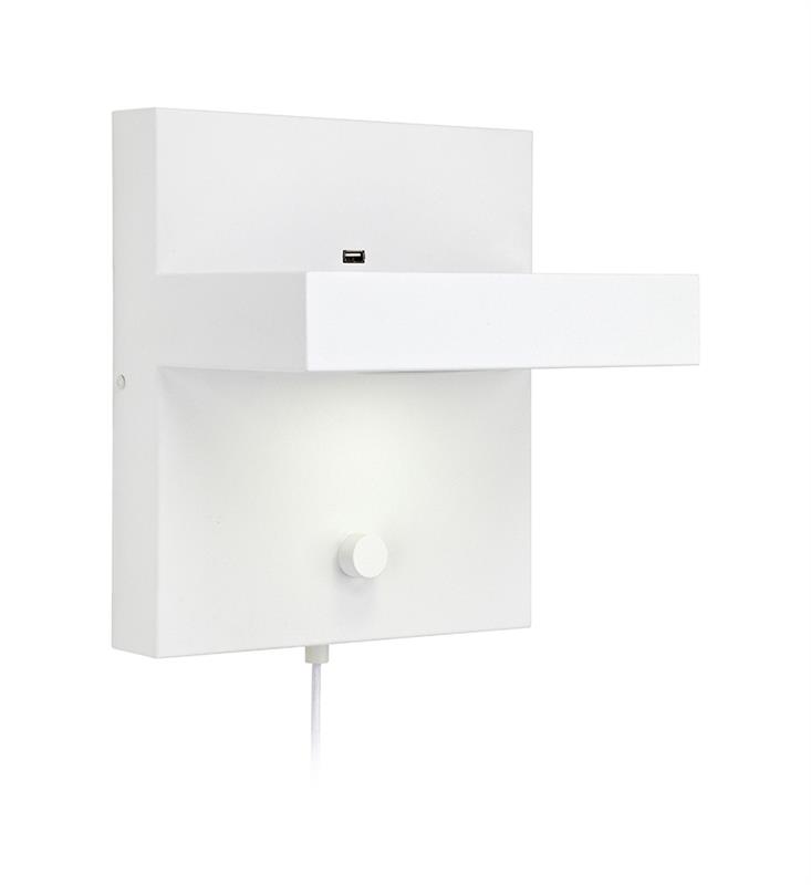 Kubik sin stilrene vegglampe med en herlig design. Tilvirket i hvit metall med innebygget dimmer og USB port for lading av mobiltelefon m.m 2 meter kabel. 5W fast LED. 525 Lumen. Varmvit 3000K. Energiklasse A. Lampen passer perfekt inn på flere plasser i husholdningen.