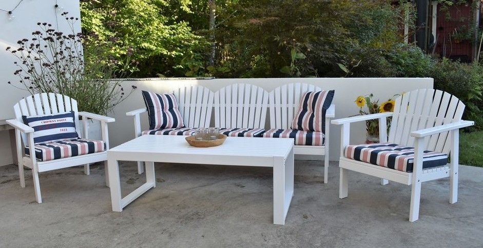 Hagemøbel gruppe i klassisk stil fra Skånska Möbelhuset. Settet består av sofa, bord samt to lenestoler. Lag en trivelig uteplass med denne fraiche møbelgruppen.