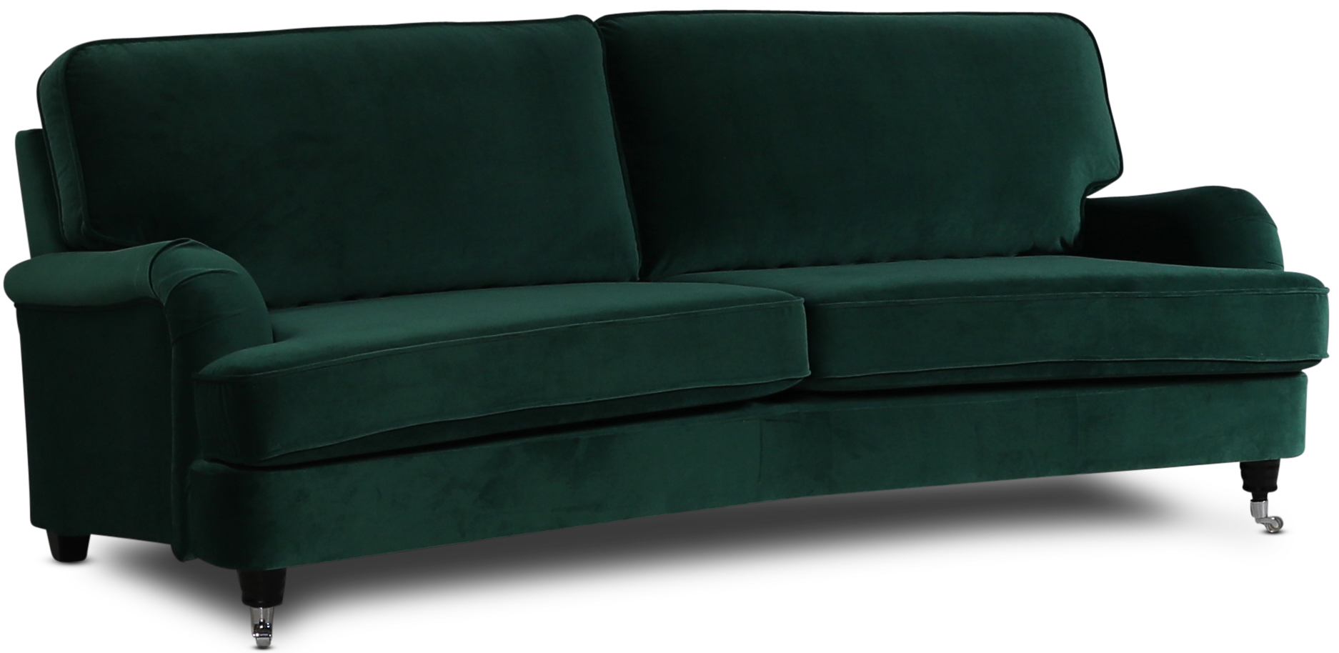 Sofaen leveres i et mørkegrønt fløyelstoff.