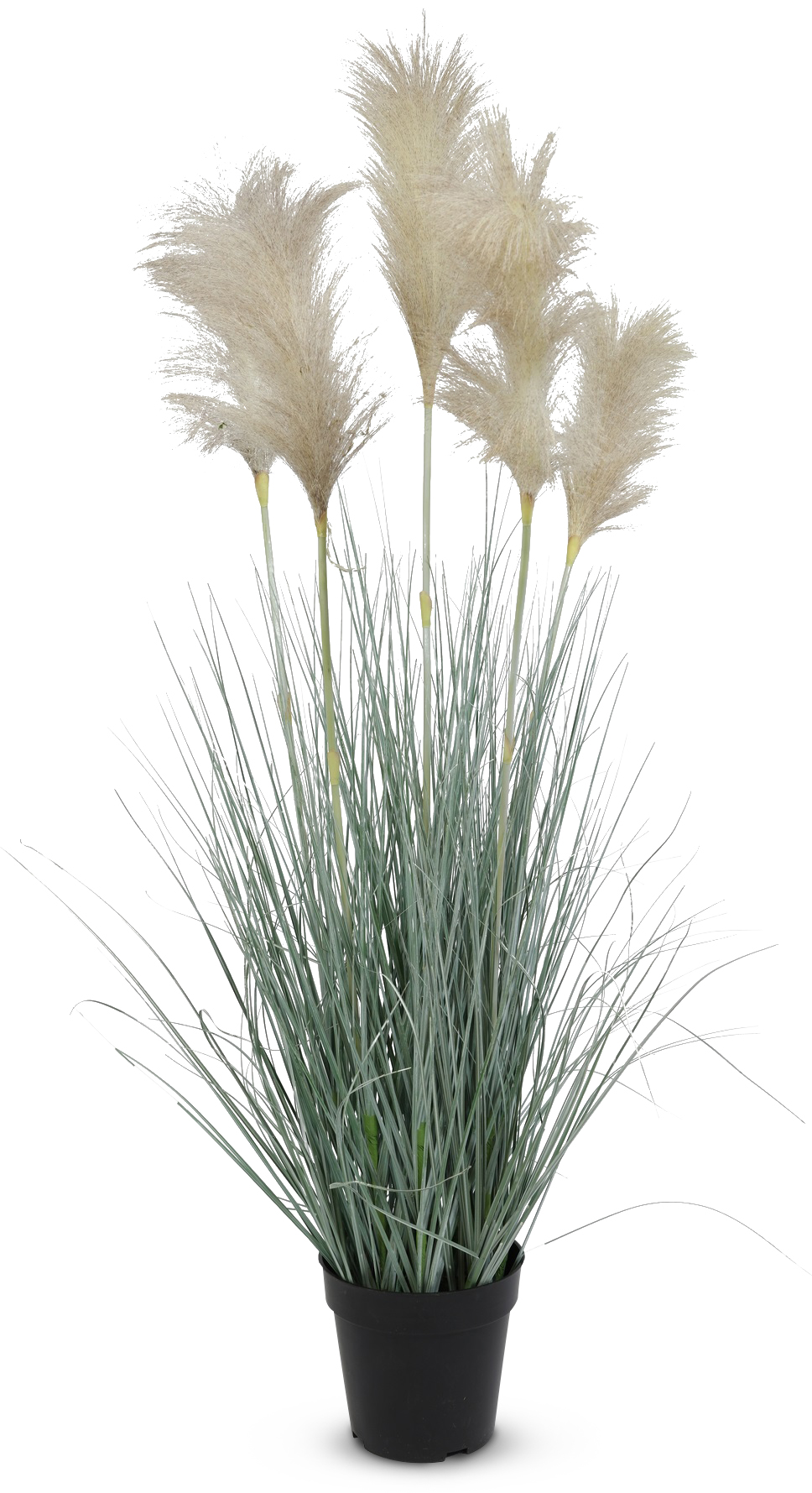 Et kunstgress med pampasgress komplett i en svart plastkrukke. Totalhøyde 82 cm høy.
