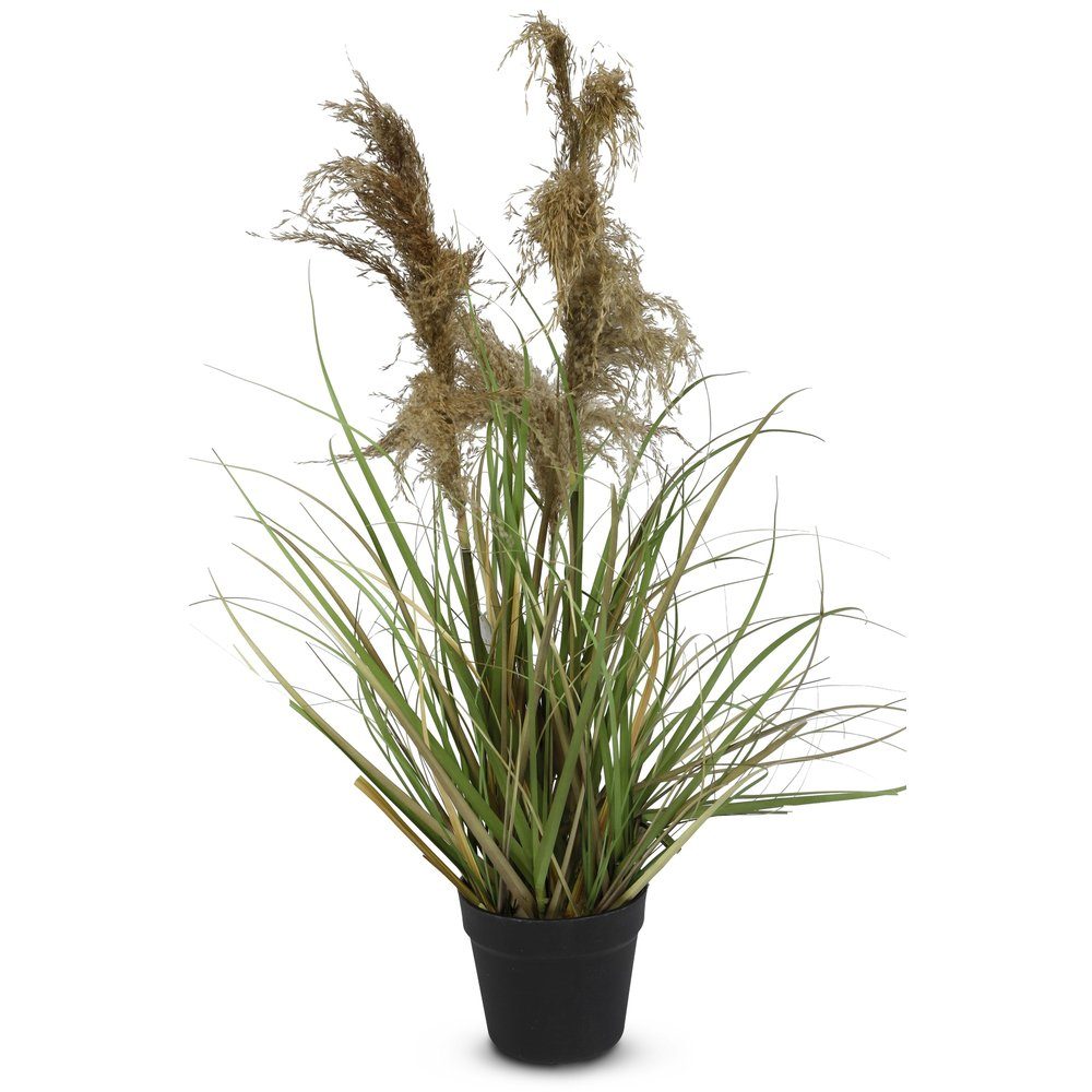 Et kunstgress med pampasgress komplett i en svart plastkrukke. Totalhøyde 94 cm høy.