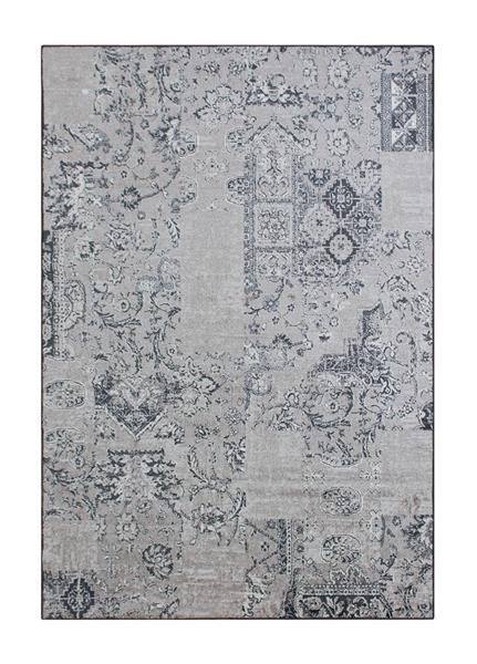 Nagari har ett melert patchmønster i hvite, grå och beige toner, med en langettering i mørkegrått. Siden matten er vevd i viskose så har den et fint lys, samt att fargene skifter etter hvordan lyset faller.