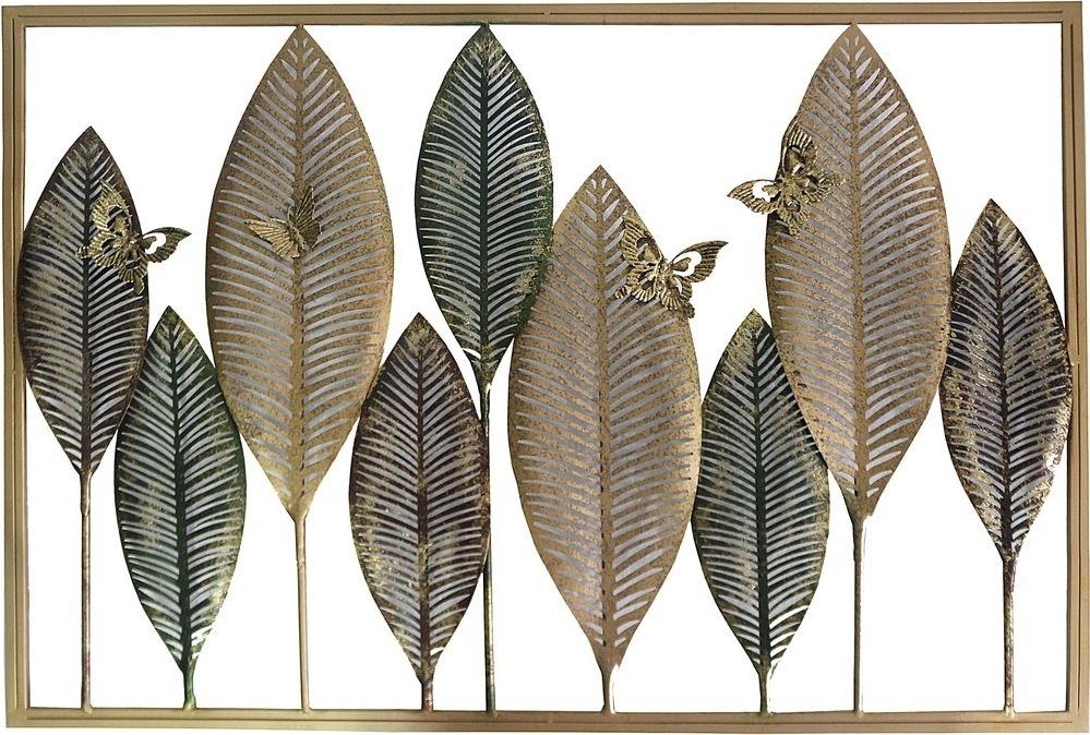 Dekorasjon av blader og sommerfugler i metall, perfekt for å henge på veggen.