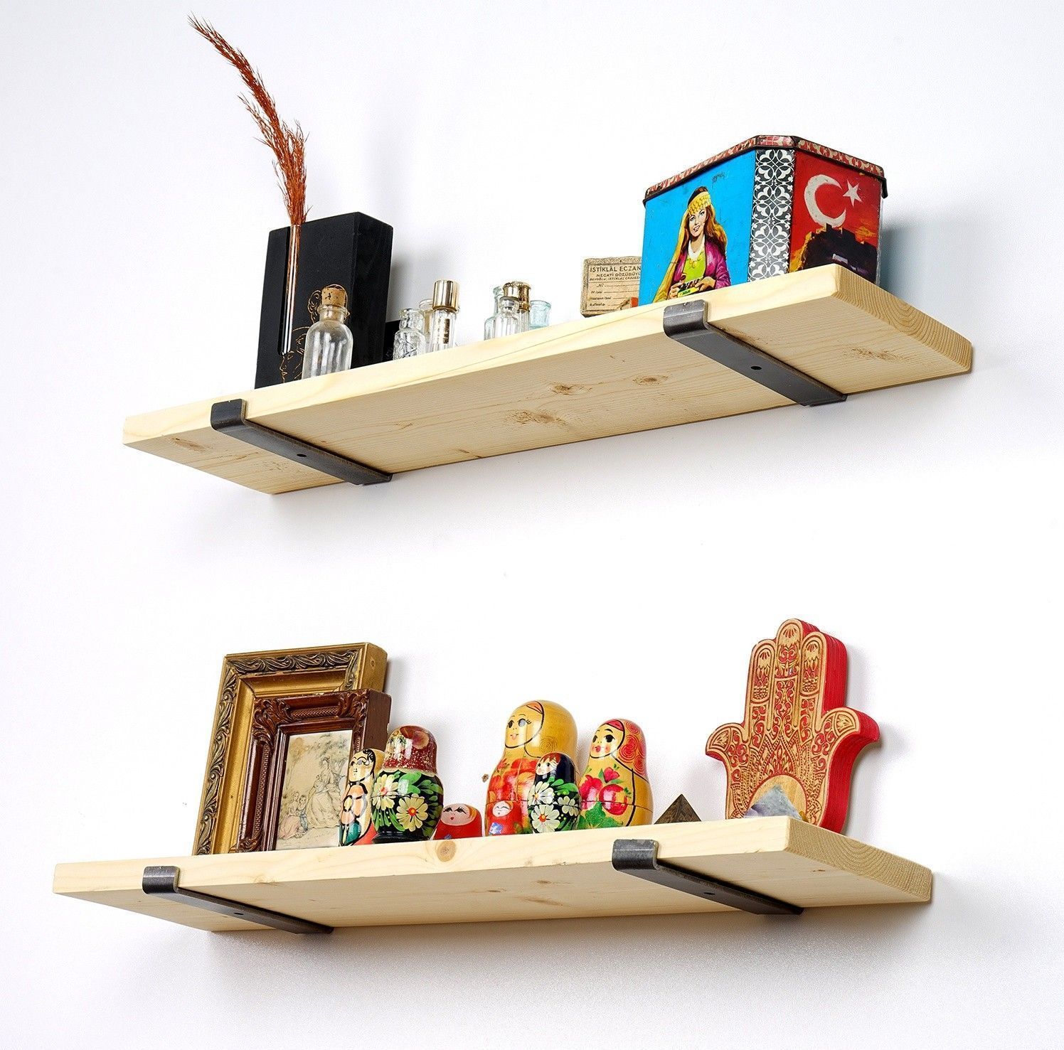 Vegghylle laget av tre og metall.