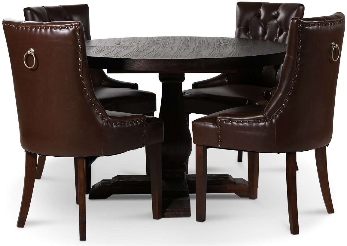 Inkluderer også 4 stk. Tuva stoler i et vintage brunt PU med antikkfargede nagler og rygghåndtak som en kul detalj. Stolen er vellaget og en av våre mest populære spisestoler i vintage stil.