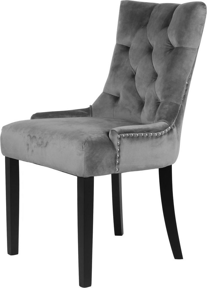 Inkluderer også 4 stk Tuva stoler i et mykt grått fløyelstoff med forkrommede nagler og ett rygghåndtak som en fin detalj. Stolen er vellaget og en av våre mest populære spisestoler i vintage stil.