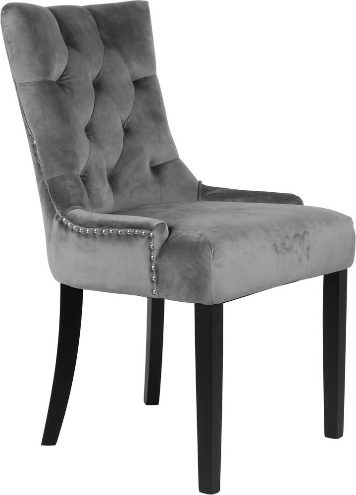 Inkluderer også 4 stk Tuva stoler i et mykt grått fløyelstoff med forkrommede nagler og ett rygghåndtak som en fin detalj. Stolen er vellaget og en av våre mest populære spisestoler i vintage stil.