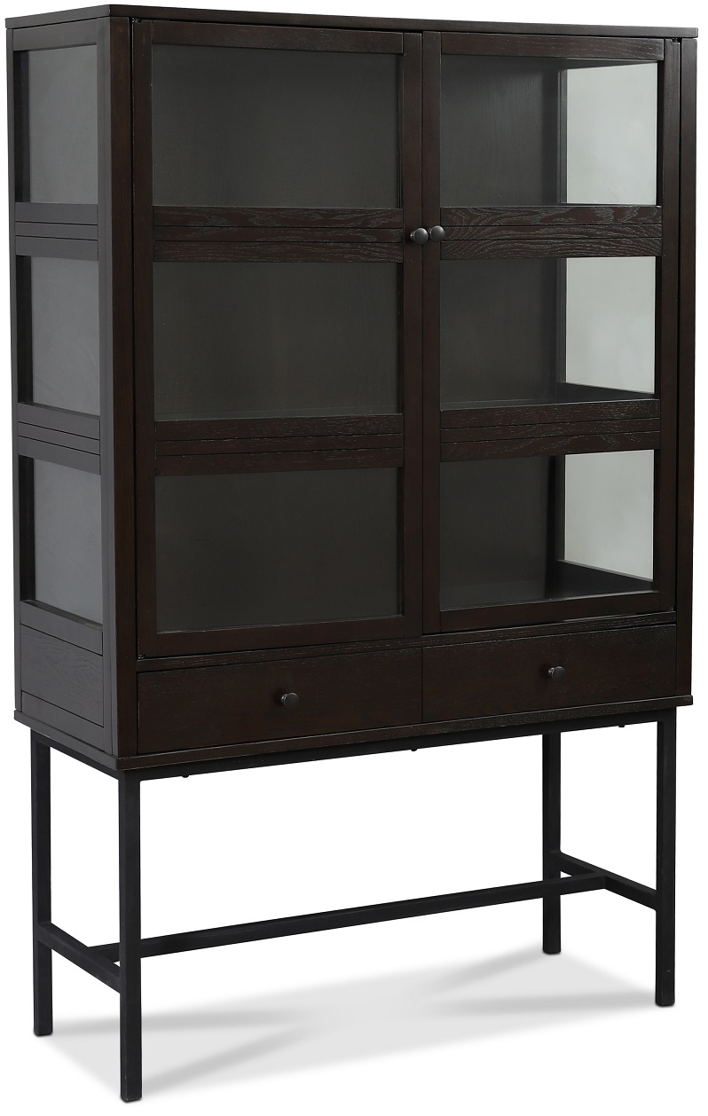 Lamier er et klassisk vitrineskap i massivt tre og finfinert eikefiner. Ramme i svart sandlakkert metallramme. Inne i skapet er to glasshyller i herdet glass. Ferdig montert fra fabrikken.