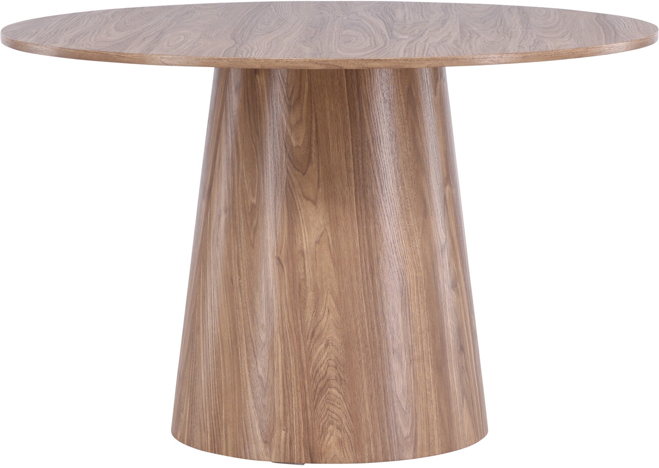 Spisebord som imponerer med sitt skandinaviske design og smakfulle design. Bordet er laget av MDF og har en tynn, rund topp sammen med en kjegleformet ramme som er sentrert under midten av bordet. Den jordaktige, valnøttlignende fargen fremhever materialets naturlige mønstre og skaper et levende uttrykk med en følelse av dybde og bevegelse. Et stilig blikkfang for hjemmets hjerte - her blir ingen utelatt.