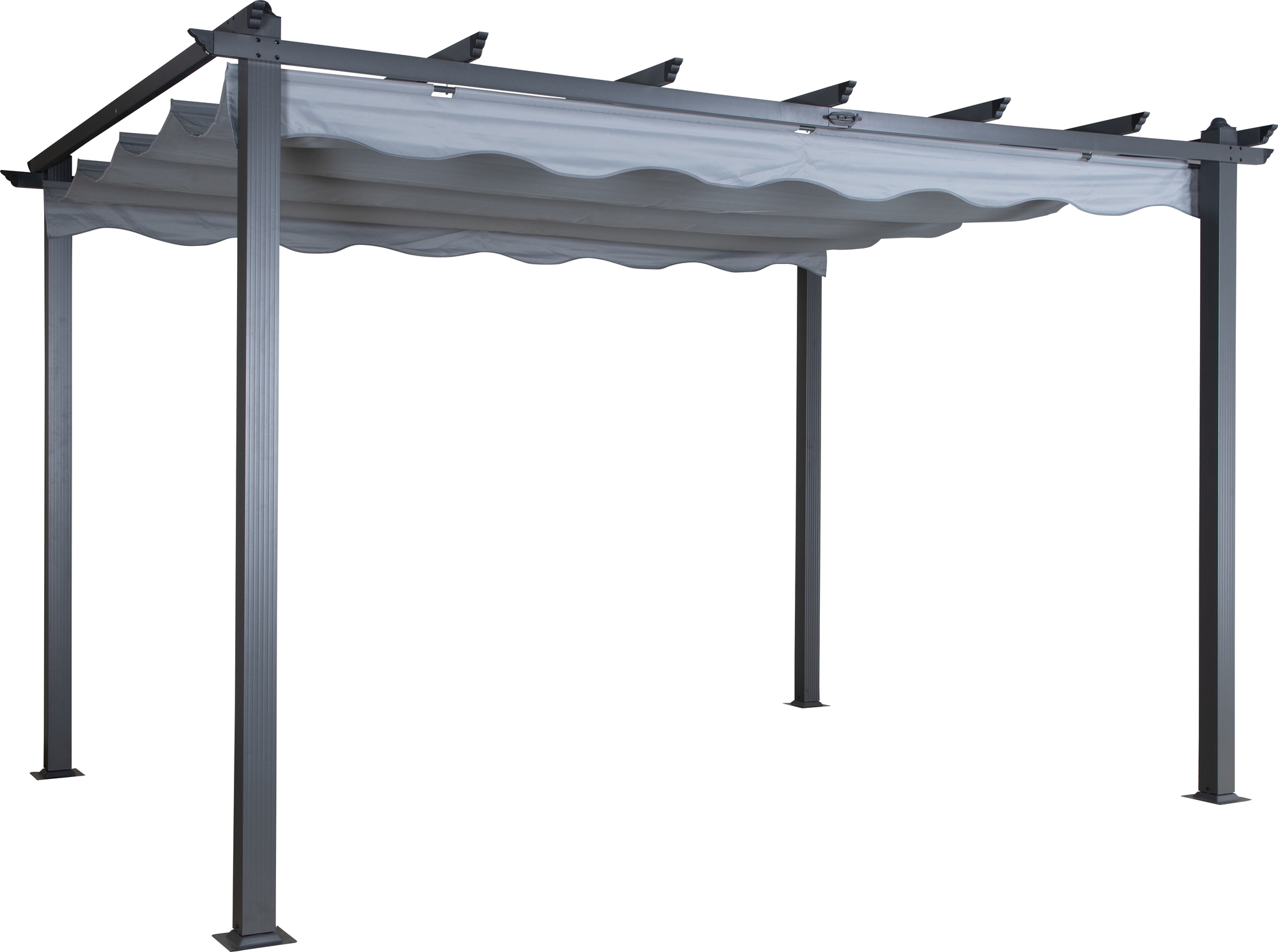 Pergola med tak i polyesterstoff som kan trekkes ut ved behov - perfekt for alle døgnets timer og værskifte. Rammen er laget av sort aluminium og stoffet er grå polyester. Samle dine kjære og du får et innrammet middagssted som garantert blir en hit på uteplassen.