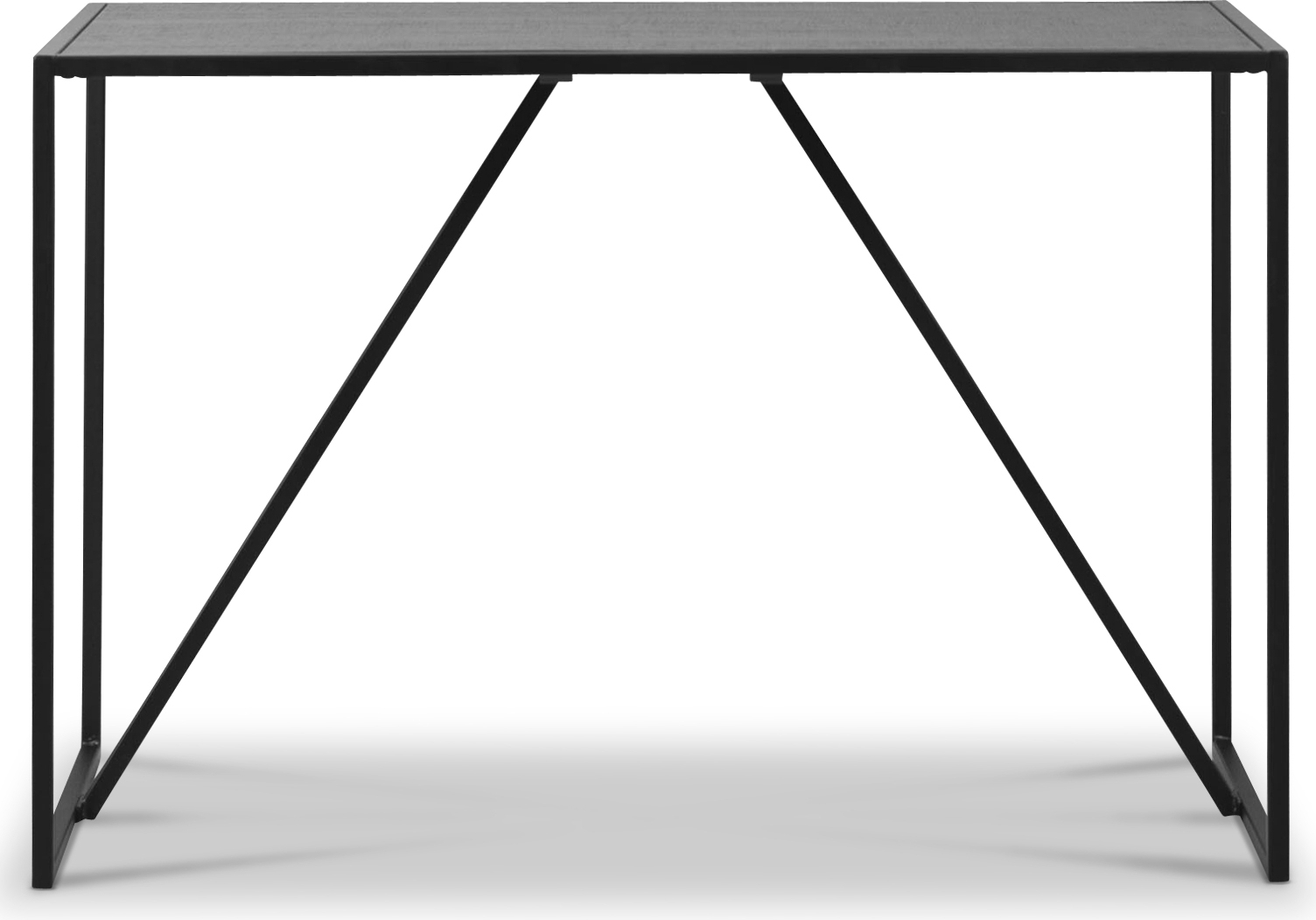 Skrivebord med stilrent svart metallunderstell. Bordplaten er gjort slik at den skal ligne brunbeiset eik. MDF plate med brunbeiset eikefoliering.